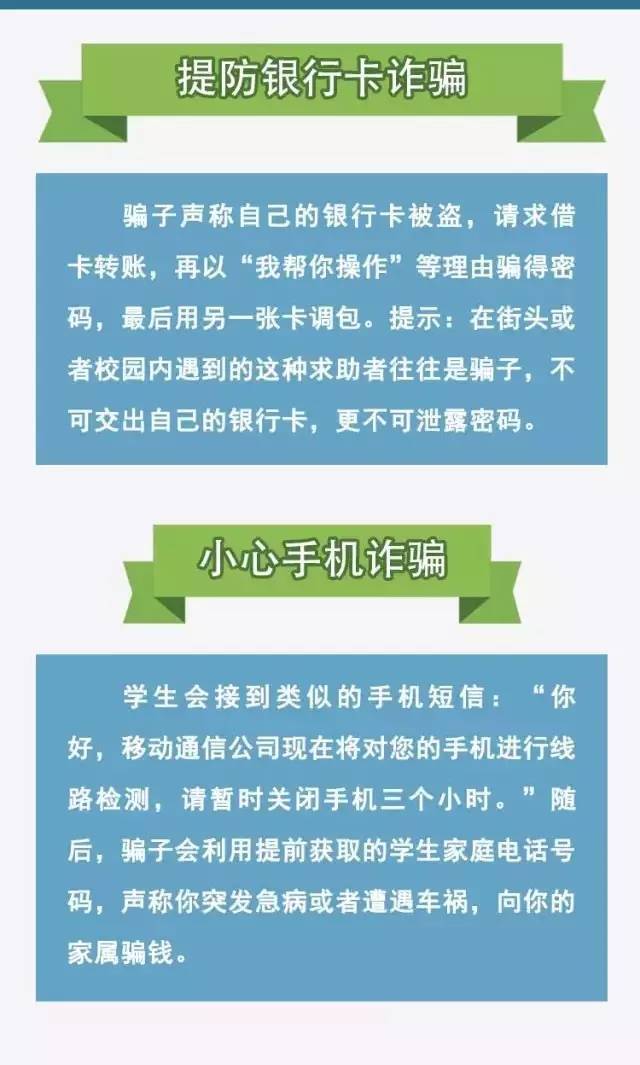 “四要”:要经常与父母联系,把自己在学校的情况告诉家长;要与家长约定好汇款条件、方式,让家长不要草率寄钱;平时要多看、多听、多学习防诈骗的知识,这样才能有效识别银行卡诈骗、网上诈骗、电话诈骗;在外要始终保持通讯畅通,牢记紧急求助电话。
